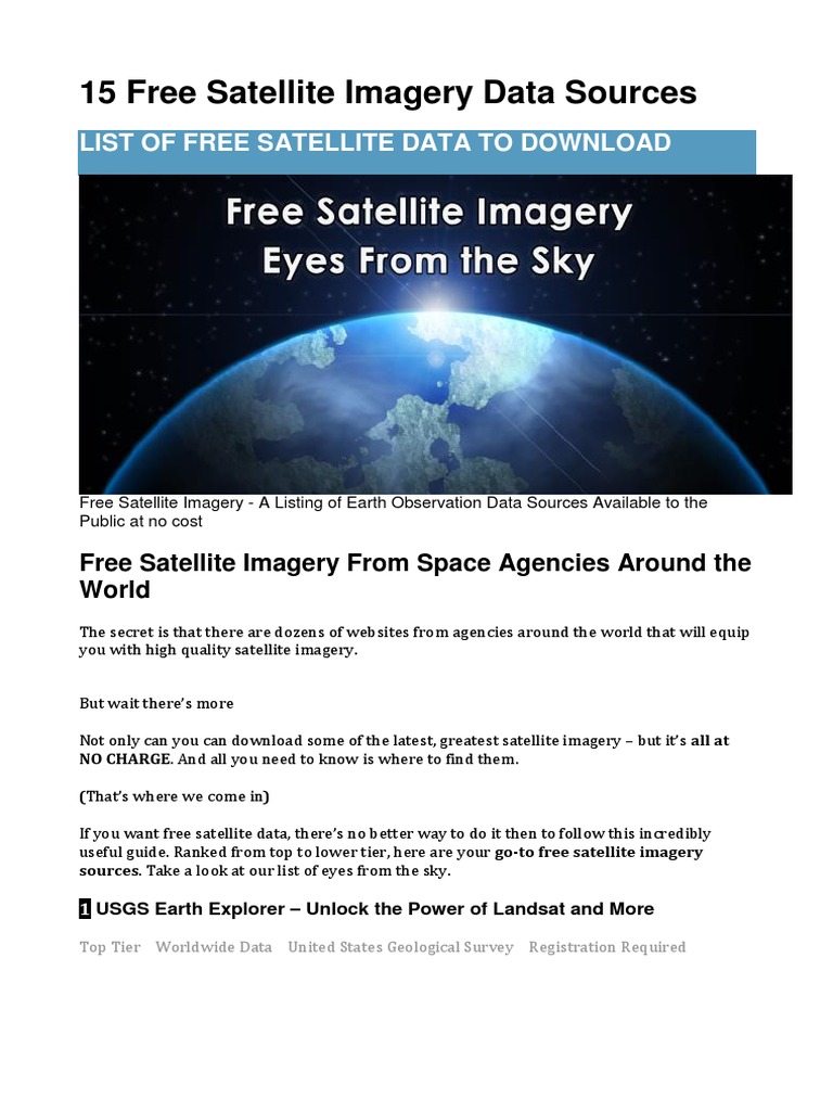 15 Free Satellite Imagery Data Sources.docx | Satellite ... from imgv2-1-f.scribdassets.com To view the images you must register. These coarse resolution satellites carve out vegetation patterns across the earth's surface. To do that you first need to mark footprint of your lidar datain the map. What we know as satellite imagery is simply the art of parking a camera in space and pointing it at earth. Depending on the dataset, free satellite imagery download may require a few extra clicks to approve however, this can be solved with the help of google translate for websites. Also, only about 10 percent of weather agencies outside the u.s. • commercial satellite imagery data sources: Do this to home in on your country, city, town, street and finally your home!